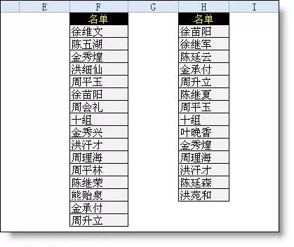 【例】如下图所示,要求对比H列和F列,找出两列相同和不同的姓名。