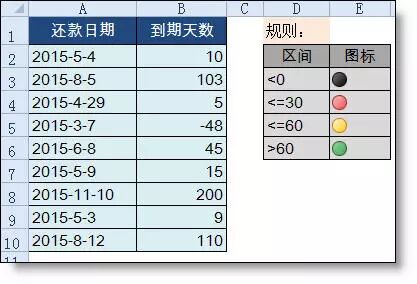 【例】如下图所示A为到期日期,要求在B列设置到期提醒,规则如下图右表所示。
