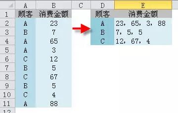 如下图所示A和B列分别为顾客和他的每次的消费金额,要求把该表合并成右侧的格式,把每个顾客的记录合并到一起,用逗号分隔开来。要求能批量完成,不能一个个的手工复制粘贴合并。
