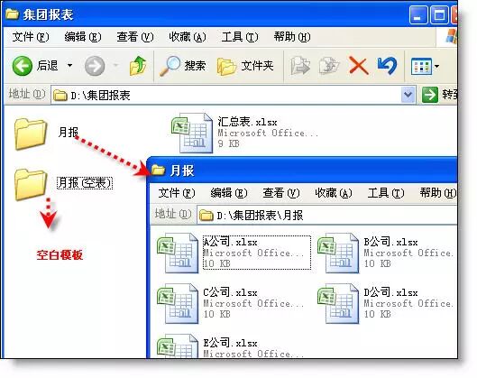 集团报表文件夹,内有月报文件夹(存放各公司上报报表)、月报空白报表文件夹(存放各公司空白报表)和汇总报表excel文件。