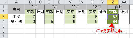 如下图所示,需要对1~12月份的计划和实际数进行求和(为方便截图)