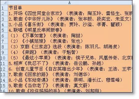 下图是春晚节目单,节目类别、名称和演员挤在一起的。要求把一列拆分成三列显示。