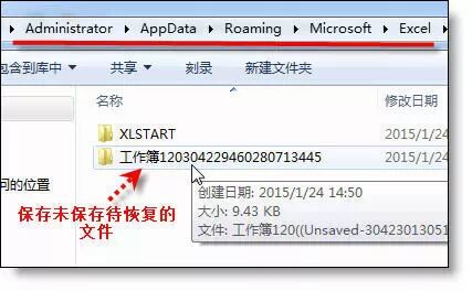 打开路径:C:\Users\Administrator\AppData\Roaming\Microsoft\Excel\ ,在文件夹内会找到的未保存文件所在的文件夹,如下图所示。
