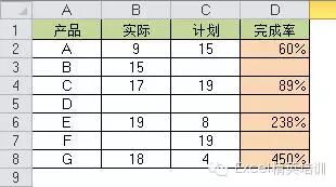 如下表在计算完成率时,如果实际和计划数有一方为空或0,则公式返回空。