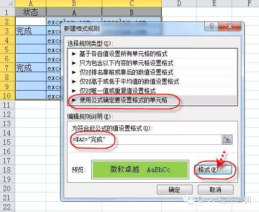 当A列值是“完成"时,该行能“自动”填充为绿色。如下图所示。