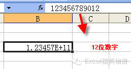 2 在单元格中输入任一个超过11位的数字,如123456789012,输入后你会发现单元格变为:1.23457E+11,如下图所示。