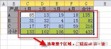 选取包括黄色行列的区域,按alt 和 = (按alt键不松再按等号)即可完成求和公式的输入。