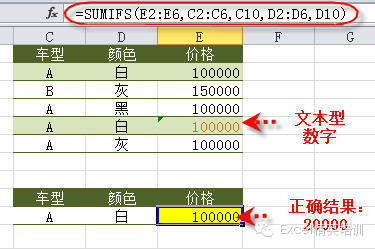 原来数据区域含有“文本型”数字,SUMIFS无法对文本型数字进行求和。下面看老大sumproduct的。