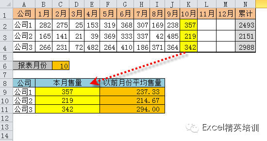 如下图所示,上表为数据源表,存放每个公司全年的销售数据,下表为生成的分析表,提取指定月份(C6单元格)的对应销量,同时还要计算前N个月份的平均销量。