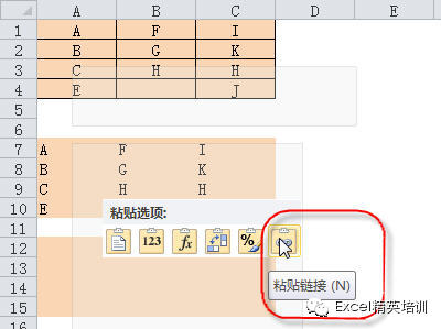 第一步:复制A1:C4区域,选取a7,选择粘贴粘 - 粘贴链接