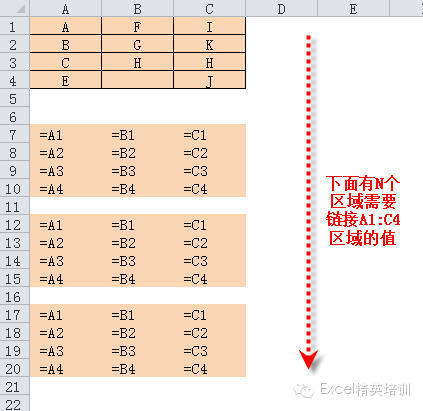 如下图所示A1:C4数据源表,现需要在下面N个区域内用=号引用该区域的值,如图中所示公式。
