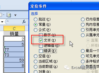 操作方法:选取数字列,ctrl+g定位 - 定位条件 - 文本