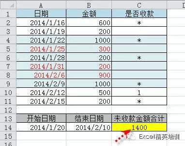 例:如下图所示表中,A列是日期,B列是金额,C列输入*(星号)表示款已收回。要求:计算指定期间内还没收回(C列为空)的款项合计。