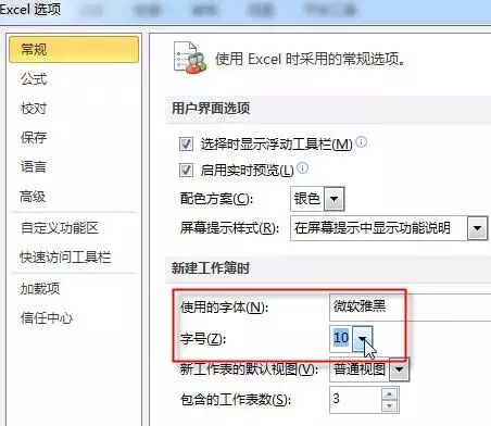 文件 - excel选项 - 新建工作簿时 - 设置字体、字号
