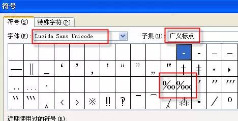 步骤: 打开“符号”窗口(excel2003版:插入 - 符号;excel2010版:插入选项卡 - 符号),选择字体:Lucida Sans Unicode,然后在右边选择“广义标点”,就可以找到这两个符号,如下图所示。