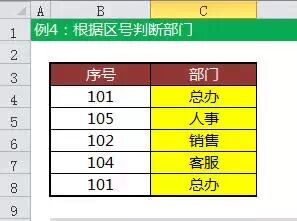 =VLOOKUP(B4,{101,"总办";102,"销售";103,"财务";104,"客服";105,"人事"},2,0)