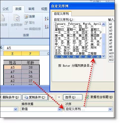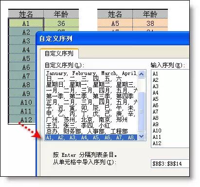 文件 - 选项 - 高级 - 添加自定义列表,把其中一表中的姓名添加进去。