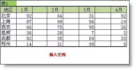 第1步 表1隔列插入空列。(具体方法原来介绍过,这里不再详述)
