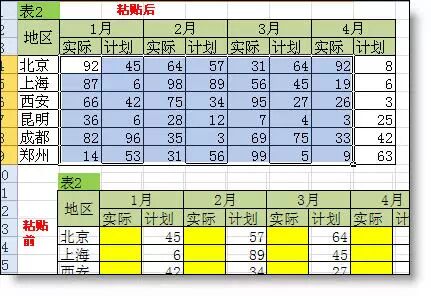分析:由于表2中实际数不相邻,只能一列一列的粘贴。如果列数多,很费时间的。但看了下面的操作,会让你脑洞大开。