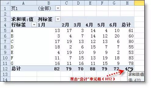 4 、数据透视表生成后,双击最右下角的汇总值所在单元格。