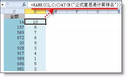 =RANK(C2,C:C)&T(N("公式意思是计算排名"))