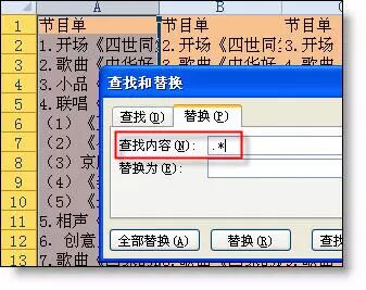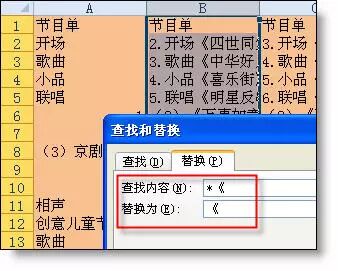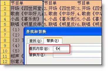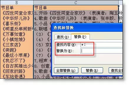 大家最熟悉的是分列法,但由于节目单中没有空格,只能用《和(作为分隔符,重要的是分列后我们还要再把这些符号补充完整,另外还要把多余的删除掉(如:表演者),干脆我们直接用“替换”功能完成。