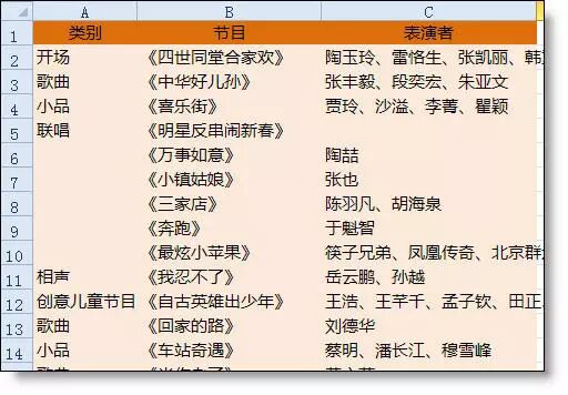 下图是春晚节目单,节目类别、名称和演员挤在一起的。要求把一列拆分成三列显示。