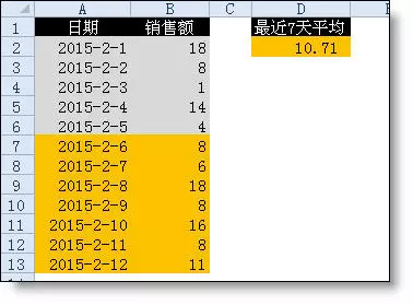 【例】如下图所示,A列是日期,B列是销售额。要求计算最近7天的平均销售额。