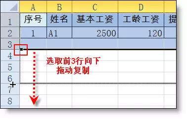 2、选取前三行向下复制。(如果中间隔2个空行则选前4行)
