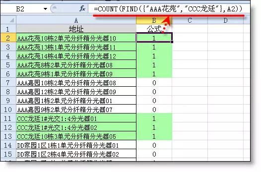 =COUNT(FIND({"AAA花苑","CCC龙廷"},A2))