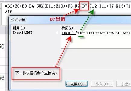 2、在打开的“公式求值”窗口中,求值会自动停在即将出错的位置。这时通过和编辑栏中的公式比对,就可以找出产生错误的单元格。(D7)