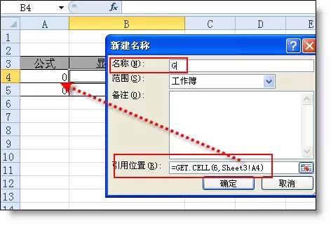 公式 - 名称管理器 - 新建名称:G =get.cell(6,sheet3!a4)