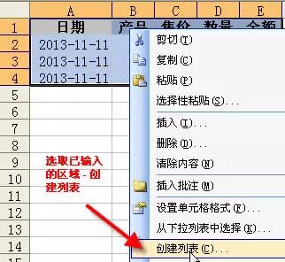 选取已输入的区域,excel2003右键 - 创建列表 (excel2010 \\n插入 选项卡 - 表格)如下图所示。