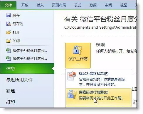 excel文件 - 信息 - 保护工作簿 - 用密码进行加密。