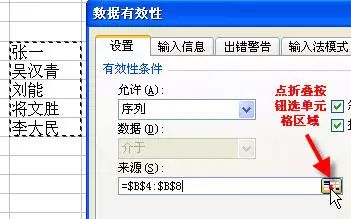 2 引用单元格的内容法。如果销售员在单元格B4:B8区域里,在“来源”后输入或点框最后的折叠按钮选这个区域。如下图所示。