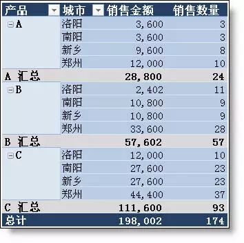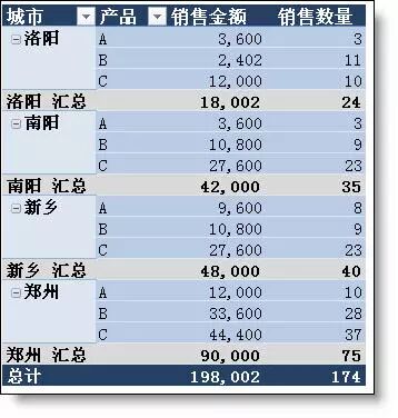 【例】如下图所示,在一个工作簿中有四个城市的销售表,需要根据这4个表格,用数据透视表进行汇总。