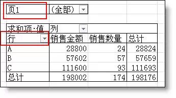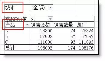 5、点击完成后,会自动生成数据透视表。把页字段名子由“页1”改为“城市”、“行”改为“产品”。