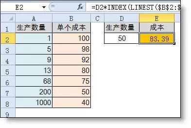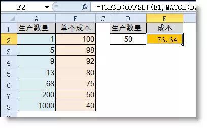 【例】如下图所示A为产品数量,B列是对应的单个产品成本。要求计算:当生产50个产品时,相对应的成本是多少?