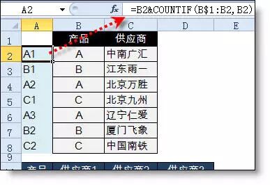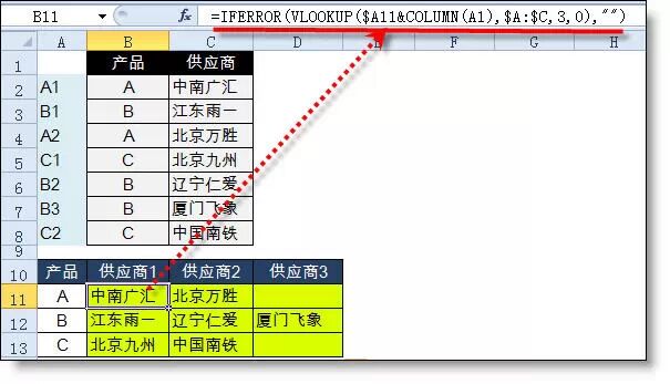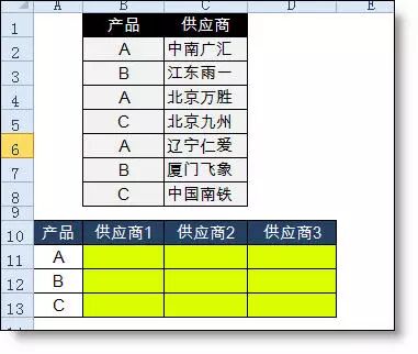 【例】如下图所示,B列是产品,C列是供应商。要求在下表中,把每个产品的供应商显示在后面列中。