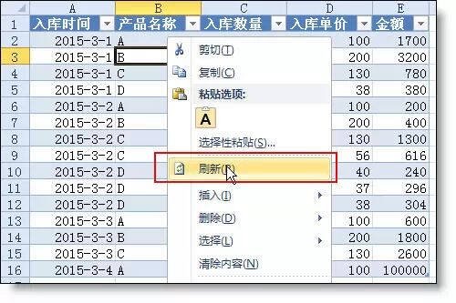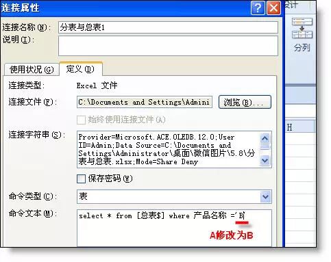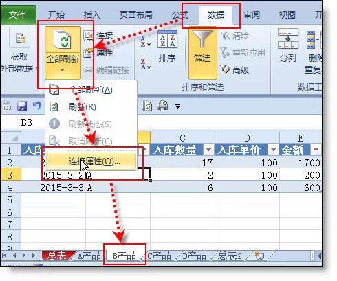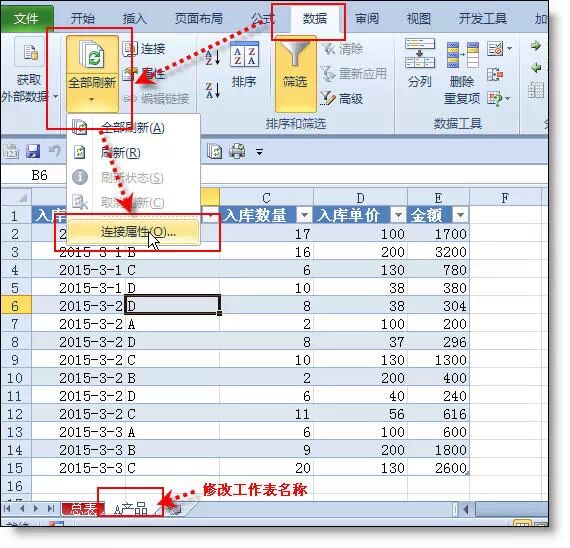 5、把新建的工作表改名为“A产品”,然后选取生成的查询表,数据 - 全部刷新 - 连接属性