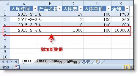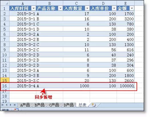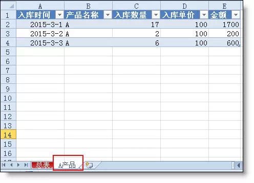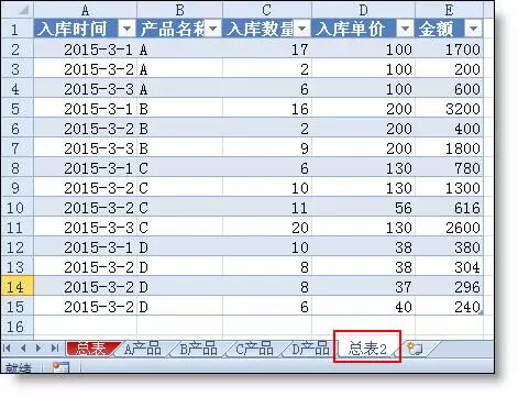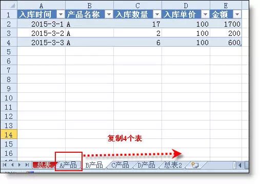 8、复制4个A产品表格,分别命名为 B产品、C产品、D产品、总表2