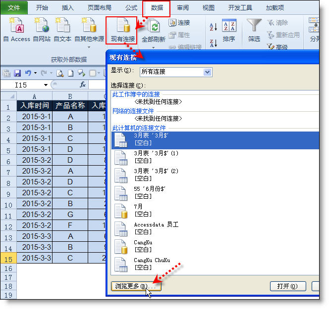 1、数据 - 现有连接 - 在窗口中点击“浏览更多”按钮。