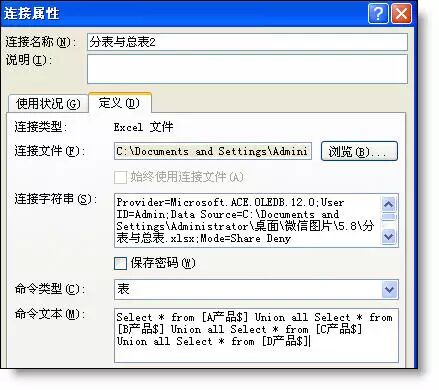 select * from [A产品$] Union all select * from [B产品$] Union all select * from [C产品$] Union all select * from [D产品$]
