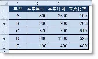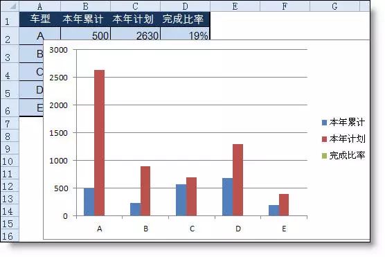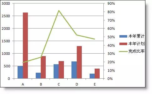 【例】如下图所示的实际与计划对比表中,要求制作图表,实际和计划数用柱形图,完成比率用折线图。