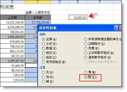 复制10000所在单元格,选取数据区域 - 选择粘性粘贴 - 除