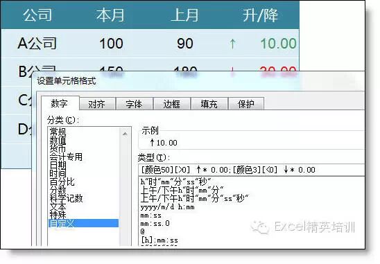 负数:数字前添加红色的下降箭头↓