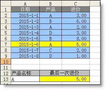 【例4】如下图所示,要求查找A产品的最后一次进价。