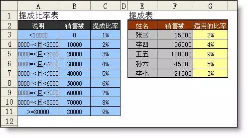 【例5】如下图所示,要求根据左表的提成比率表,在右表中根据销售额在G列查找适用的比率。