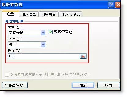 解决方法:选取输入单元格 - 数据 - 有效性 - 允许:文本长度,输入18