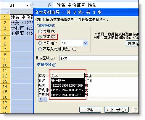 解决方法:在分列的第3步,选取身份证列,选取文本类型即可。